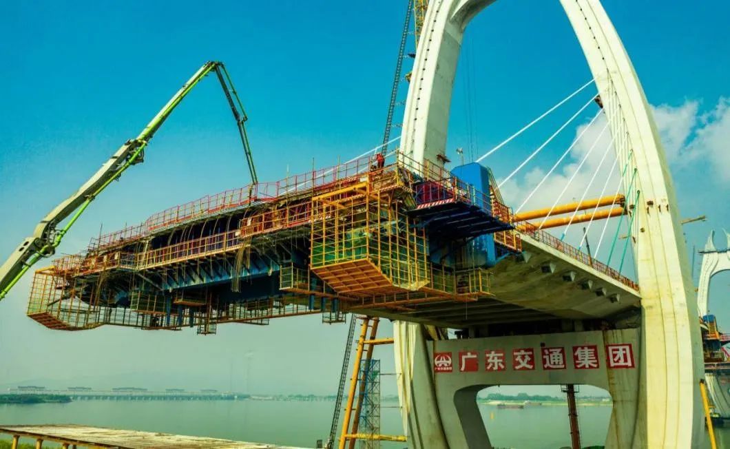 北江特大桥主桥结构复杂且施工难度大,为目前国内规模最大的四塔双索面双向预应力混凝土梁斜拉桥。其中3号索塔高约142米,混凝土总量约1.4万方,塔身曲线层叠,呈现出凤凰翎羽的形态。