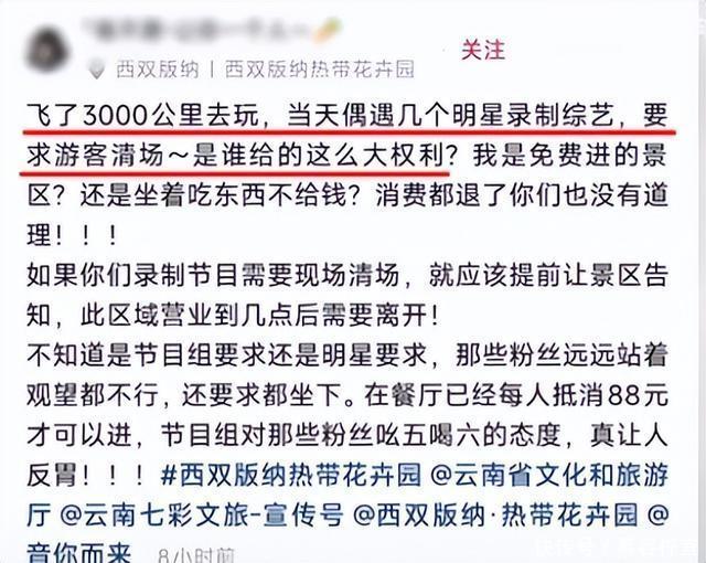 人红是非多,人不红架子多! 最近,在云南的一个旅游景区里,发生了这样一件事情, 当天,旅游景区正常营业,不少游客前来旅游,场面也是相当热闹, 但让所有人没想到的是,本来高高兴兴的一场旅游,却被娱乐圈的几位明星扫兴。 这群明星里,有的是家喻户晓的歌手,有的根本没听说过他的名字, 他们正在录制一档综艺,为了避免游客影响拍摄, 他们竟然直接对游客进行了驱赶,这也就算了,最让人接受不了的是他们那嚣张的态度! 咱就是说,内娱的明星什么时候这么狂了? 最近几年的娱乐圈里,优秀的影视作品少之又少, 大家纷纷把目光放在了综艺节目上,尤其是户外旅游类型的综艺, 这不,音乐类综艺《音你而来》最近也是在云南开启了第三季的录制。 作为江苏卫视推出的一档综艺节目,它主要是通过邀请歌星加盟,前往其他地方旅游, 沿路会看到祖国的大好河山,也会看到丰富的城市风光, 在这个过程中,音乐人结伴深入当地采风,融合地域文化与民族元素进行音乐创作。 像张碧晨、潘玮柏、薛凯琪等知名歌手都曾参加过这档节目, 这季邀请来的嘉宾有容祖儿、张碧晨、周震南等九位歌手, 看这阵容就知道不简单,覆盖资深港乐歌手、内地实力唱将、人气唱跳偶像与新生代原创音乐人。 咖位跨度较大,并非全员顶流配置, 其中多位新生代艺人,大众认知度偏向圈层内, 也因此,在驱赶游客的事情发生后,不少人直呼“咖位不大,架子不小”! 据悉,在云南录制节目一共九天的时间,从3月2号到11号, 在这期间,艺人在节目组的安排下进行拍摄,场地也并未承包下来, 景区里的游客人满为患,很大程度上会影响节目的拍摄。 但是,节目组发现问题也没有及时与景区沟通,进行闭园, 反而直接驱赶游客,让很多外出旅行的游客感受到了满满的“恶意”! 在大众普遍认知里,公众人物现身公共景区录制综艺, 理应尊重景区运营规则与付费游客的合法权益。 即便因拍摄需要临时管控区域, 常规操作也应是联合景区提前发布公示, 和现场游客友好协商,或是提前完成场地包场。 而非在无告知、无补偿的前提下,直接安排工作人员强硬清场, 侵犯了游客的正常消费与游玩权利。 3月8日,有网友在社交平台上分享了了自己的亲身经历, 根据网友的描述,自己在云南西双版纳花卉景区花卉40块购买门票进入, 又在景区内的餐厅消费了88元,这才有了一个可以休息一会儿座位。 本来这是一场再普通不过的旅游,却偏偏遇上了拍摄综艺的明星, 能够偶遇明星,对于普通人来说也是一件非常高兴的事, 大家一般都会上前去要合照和签名。 可这些明星并没有和游客进行友好互动,反而还爆发了冲突, 起初,节目组以拍摄节目为由,让前来的游客坐在椅子上, 不要起哄,以免耽误正常拍摄进度。 游客们也出于换位思考,选择听取节目组的意见, 可后来,节目组工作人员突然对现场游客进行了驱赶, 言辞犀利,态度也是非常恶劣,也因此引得了在场游客的不满。 毕竟,自己花了钱来享受当地风光,却被节目组无端驱赶,换谁谁心里都不会舒服, 他们提出质疑,并表明自己是花钱消费才进入该区域西安股票配资论坛,有权利正常停留, 可工作人员不仅没有给出合理解释,反而还一直强调要进行综艺录制无关人员马上撤离。 没有一丝的协商空间,也没有提及后续的补偿或者致歉方案, 游客想要沟通的时候,工作人员依旧坚持清唱要求, 最终许多游客无奈离开了现场。 这段冲突被游客拍下发到社交平台后,引发了大量的网友围观, 从现场画面可以看到,参与录制的9位艺人只是在一旁静静等待,并没有进行制止, 也因此,九位艺人以及节目组都被推上了风口浪尖! 明星户外录制综艺,本就存在诸多不确定性,尤其是在付费景区内, 许多游客不远万里前来景区游玩,他们应该得到自己应有的保障, 明星艺人也不能把行业内的特殊待遇当成凌驾与普通游客之上的特权! 截止到目前为止,节目组以及这9位艺人针对“驱赶游客”一事儿没有进行任何的回应, 3月9号,涉事西双版纳热带花卉园率先通过社交媒体做出了回应, 景区的工作人员针对游客清场争议给出了官方说法。 他们表示: 他虽然进行了回应,但网友的议论声仍旧没有停止, 因为景区的回应并不真诚,以录制区域小、不影响游客、录制已结束为中心, 完美回避了游客反映的“强制清场、工作人员态度嚣张”等问题。 最关键的是,因为节目组的这一出,导致很多游客的旅行体验非常不好, 如果真诚道歉,那么就应该对当天的游客进行一个补偿。 总而言之,无论是景区工作人员,还是艺人和节目组, 他们都在这件事情的处理上十分欠妥,有网友已经投诉到当地文旅局, 至于最后会有一个怎样的结果,我们也只能等官方的回应。 最后也再说一句,明星也只是一个职业,不要总觉得高人一等, 在娱乐圈里,不管你们的规矩如何,出了圈外,大家就都是普通人,没有高低贵贱之分!